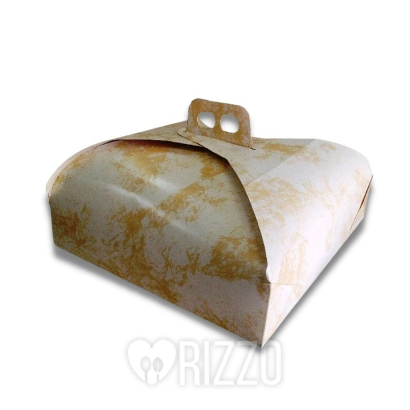Porta torte in cartone beige leggermente decorato, facile da montare e