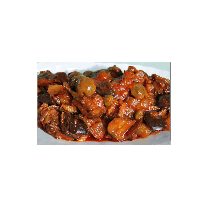 Melanzane, sedano, capperi e cipolle, avvolti nel sugo e nell'agrodolce.