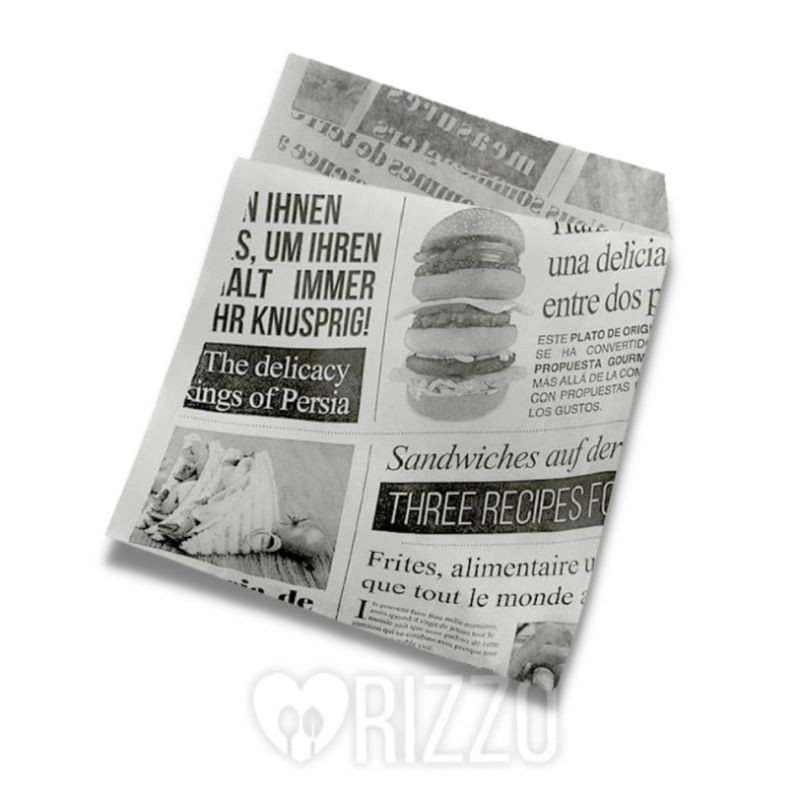 hamburger. Formato 15x20. Colore bianco con stampa a colori raffigurante carta